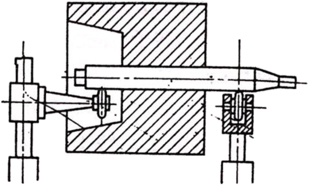 那么我們在考慮上述事項的基礎上,先要選擇適合各轉子的通用平衡機,那么對于標準型通用平衡機不適用的轉子來講,大部份的情況是,或者在通用型的平衡機上附件,或僅做局部改動使用通用平衡機。如圖所示的轉子,如果不加處理的話,就沒辦法裝在通用平衡機上,如果準備好特殊懸臂滾子支承,那么這樣的問題就能解決了,與此相同的例子為數(shù)不少。